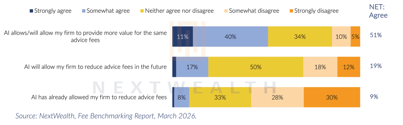 Advisers do not believe that AI usage will cut the cost of advice. Over half of advisers (51%) agree that AI will allow them to provide more value for the same fees. But only 19% believe it will enable them to reduce fees in the future and just 9% say AI has already led to a fee reduction.